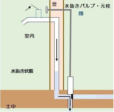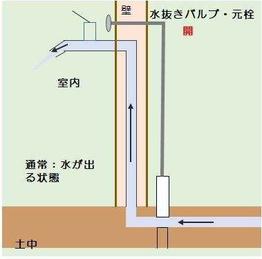 水道の蛇口を開けることで空気が管の中に入っていき水を押していきます。すると、元栓のあたりに土の中に水が抜けるところがありそこから流れ出ていきます。こうして、蛇口や配管内にあった水はなくなり凍る事はなくなります。